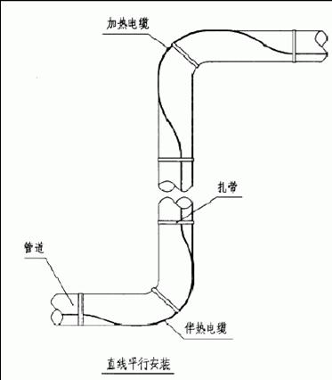 4)直線平行安裝時,伴熱電纜應沿彎頭凸面安裝,并在彎頭的兩端及中間作固定 |