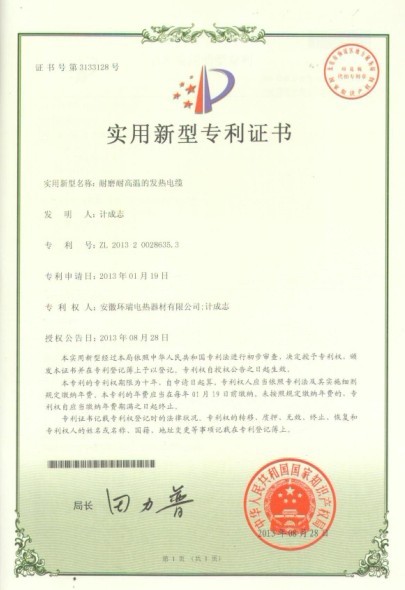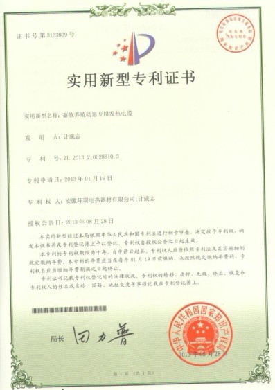環瑞自成立研發小組至科學技術中心期間,通過獨立開發,引進國外先進的生產工藝與技術,與合肥工業大學建立長期合作關系,聘請相關專業的技術專家等模式,投入大量的人力物力。我司以安全,實用性能為目標,通過改變發熱電纜結構與原材料,已研發成功。目前已獲得了關于畜牧養殖專用的國家專利證書,研發出耐高溫,耐磨的雙層絕緣的發熱電纜獲得了2項國家專利證書。包括之間我司獲得的“混凝土養護發熱電纜”“天溝融雪專用發熱電纜”,截止,我司已獲得了5項關于發熱電纜的國家專利證書,我司發熱電纜的生產技術已達到國內先進。共計19項專利。新的專利證書已下達。