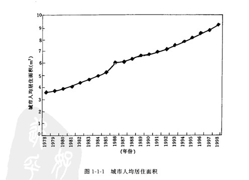 我國地域廣闊.人口眾多.房屋建筑規模巨大。其中住宅建設約占居住建筑的92%.而住宅,是世界各國都面臨的社會問題。“人人享有適當的住房”已成為聯合國第二次人居大會所提出的戰略目標。改革開放以來.從1979年到1998年底.我國城鄉新建住宅建筑面積158億 ㎡其中城鎮住宅宅 約35億 ㎡.農村作宅約123億MI.全國城市人均居住面積從3. 6 ㎡增加到9.3  ㎡(圖一1一1).竣 工面積從3 752萬 ㎡增加到47 600萬 ㎡(圖1-1-2).城鎮住宅建設投資從39.21億元增加到4  310.81億元(圖1-1 3). 1.7億戶遷入新居."八五"期間共完成城市住宅建設投資8 543億元.竣工 住宅10.5億 ㎡,僅1995年住宅竣工面積3.3億 ㎡.比“七五”期間增長76%.九五.期間計劃建設 住宅12億 ㎡,比“八五”期間增長14.3%.到1999年底。我國設城市加為668個.當年全國城市新 建房屋竣工面積4.362 5億㎡.其中住宅2.971 6億㎡.當年底.全國住宅總使用面積為30.505 2億 ㎡.總居住面積為21.011 2億㎡.人均使用面積達到14.2 ㎡.人均居住面積達到9. 8 ㎡分別比上 年增長0.6和0. 5 ㎡.居民生活條件大有改善。住宅建設量大面廣.至今仍呈上升趨勢.而且這個 上升趨勢還將持續20-30年。由此看出,我國住宅建設正處于快速發展階段.不僅是中國歷史上的 最高峰.也是世界上任何一個國家所不可比擬的。