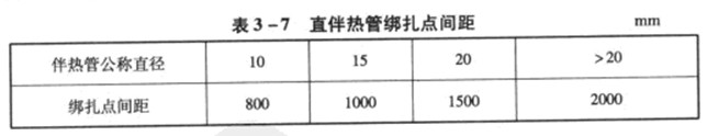 伴熱管應(yīng)與主管平行安裝,并應(yīng)自行排液。當(dāng)一根主管需要多根伴熱管伴熱時(shí),伴熱管之間的距離應(yīng)固定。水平伴熱竹宜安裝在主管下方或靠近支架的側(cè)面,鉛垂伴熱管應(yīng)均勻分布在主管周圍,不得將伴熱管直接點(diǎn)焊在主管上,而可采用綁扎帶或鍍鋅鐵絲等固定在主竹上。彎頭部位的伴熱管綁扎帶不得少于3道.直伴熱竹綁扎點(diǎn)間距應(yīng)符合表3一7的規(guī)定。