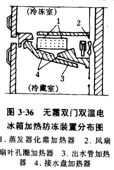 加熱防凍裝置中的出水管加熱器處于經常加熱狀態,接水盤加熱器和風扇扇葉孔圈加熱器則僅在蒸發器加熱化霜時才工作。接水盤加熱器裝置在接水盤的外表面,其作用是防止霜水滴人接水盤內凍結積累而損壞周圍結構。裝置出水管加熱器的目的是防止霜水導出箱外時發生“冰堵”,造成霜水滋出盤外,淋濕并污染食品。風扇扇葉孔圈加熱器裝置在風扇扇葉孔圈部位,在對蒸發器加熱化霜時它對扇葉孔圈部位加熱,防止該部位因凝霜過厚而將扇葉卡住,造成箱內冷風的正常循環中斷,甚至燒毀風扇電機。