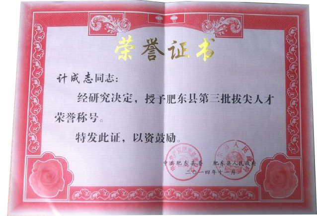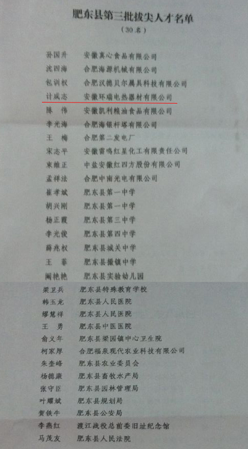 肥東縣委、縣政府為表彰環(huán)瑞公司對肥東縣當(dāng)?shù)亟?jīng)濟(jì)發(fā)展所作的貢獻(xiàn),特授予環(huán)瑞董事長計成志“肥東縣第三批拔尖人才”榮譽(yù)稱號。