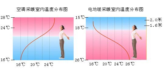(2)從溫度梯度看:電采暖供暖是通過低溫輻射,加熱室內密實物體,然后令室內空氣均勻升溫,其溫度梯度自下而上遞減,讓人感受足暖頭涼;而傳統散熱暖氣片和空調的溫度梯度則剛好相反,是自上而下遞減的,久之會讓人感受頭暈不適。