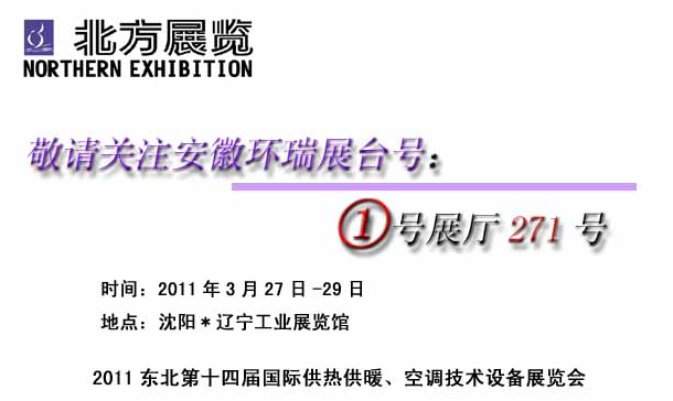 2011年3月27日-29日,安徽環(huán)瑞參加東北國際供熱空調設備展覽會。屆時,我們公司將展出公司的新型技術產品。希望廣大新老客戶來我展臺參觀洽詢,我們的展會人員將以飽滿的情緒接待來至世界各地的每一位關注我們安徽環(huán)瑞的貴客。