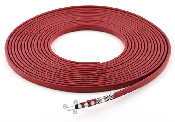 1、銅芯導(dǎo)線 2、低電阻過渡層 3、PTC芯帶 4、改性聚烯烴絕緣層 5、改性聚烯烴絕緣層 6、金屬屏蔽層 7、低煙無鹵外護(hù)套(可定制氟塑料護(hù)套)